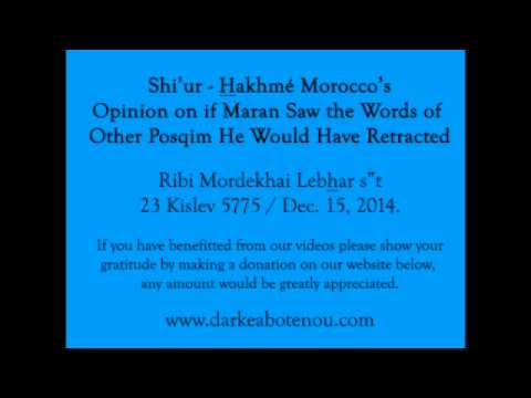 Moroccan Customs and Halachot, Shiurim / Posted on December 16, 2014June 12, 2018 Shiur – Opinion of Moroccan Sages: If Maran saw the words of other poskim, would he have retracted?